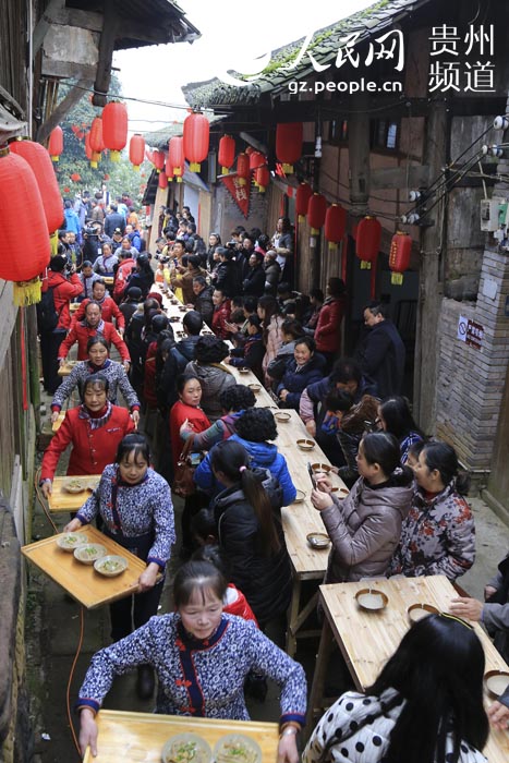 A festive “Long Street Banquet” is held in Datong ancient town, southwest China’s Guizhou province on Feb. 8, 2015. The banquet is a local celebration for the Chinese New Year. This year, themed “looking for the unforgettable flavor of New Year”, the banquet attracted over a thousand people. (People’s Daily Online/Weng Yongxue and Yu Dejiang)