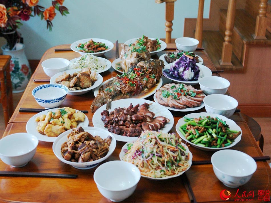 The Spring Festival is approaching. Chinese people are heading home from every corner of the world to enjoy this most significant family reunion. The most important feature of the Spring Festival, or Chinese New Year, is having abundant food. The gathering of the whole family for a banquet is the culmination of a year's hard work. (Photo/people.cn) |