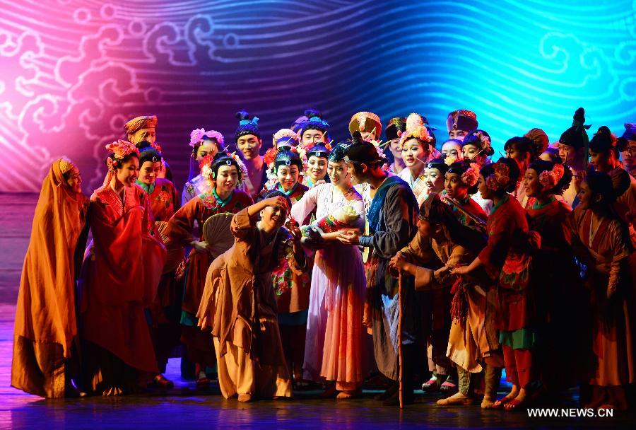 Actors perform during a dance drama entitled "The Dream of the Maritime Silk Road" in Quanzhou, southeast China's Fujian Province, Feb. 11, 2015. (Xinhua/Wei Peiquan)