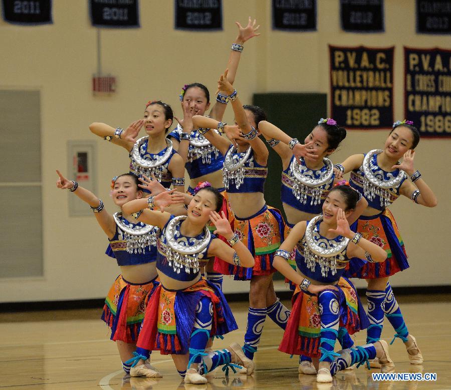 Students from the High School Affiliated to Renmin University of China perform to celebrate the upcoming Chinese lunar New Year, in Washington Feb. 12, 2015. (Xinhua/Bao Dandan)