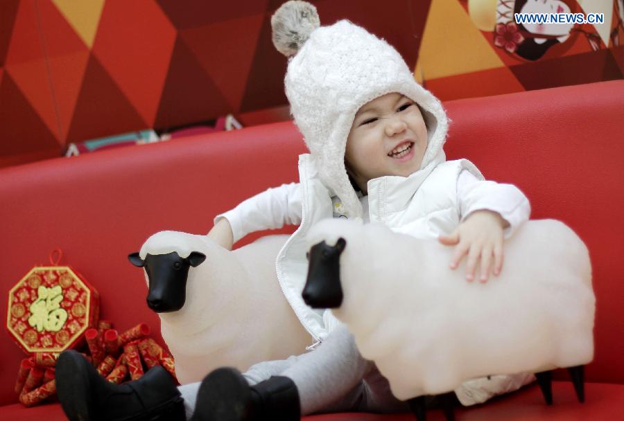 A kid is attracted by the sheep lanterns displayed at a shopping mall in Vancouver, Canada, Feb. 12, 2015. About 180 sheep lanterns are installed at a shopping mall in Vancouver to celebrate the upcoming lunar year of the Sheep. (Xinhua/Liang Sen)