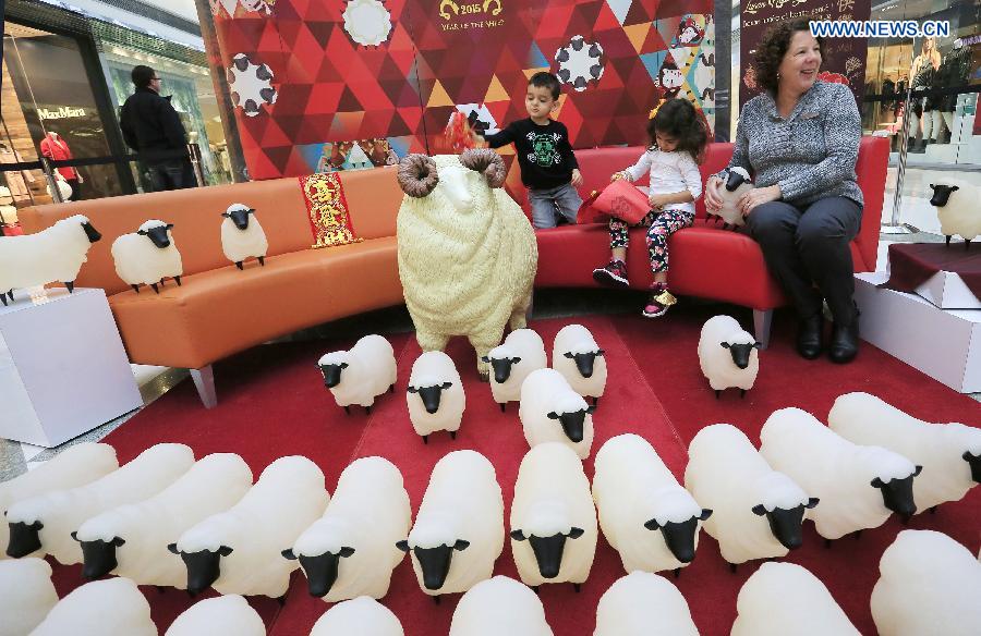 People sit beside sheep lanterns displayed at a shopping mall in Vancouver, Canada, Feb. 12, 2015. About 180 sheep lanterns are installed at a shopping mall in Vancouver to celebrate the upcoming lunar year of the Sheep. (Xinhua/Liang Sen)