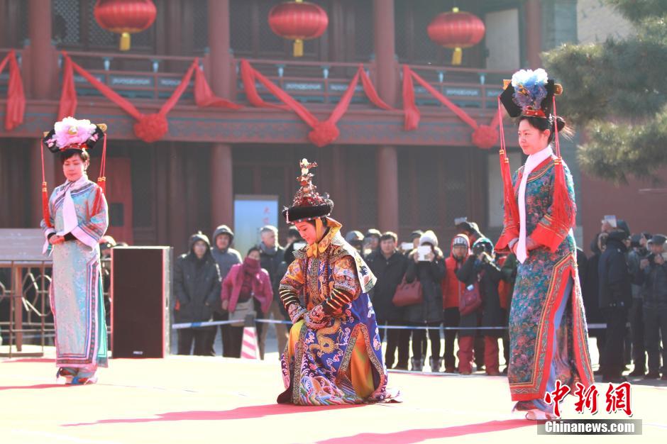 The Qing Dynasty royal celebration ceremony for the Chinese New Year is performed in Shenyang Imperial Palace on Feb. 11, 2015. Over 70 actors attended the performance, which reproduced the scene that the Qing emperor extended New Year greeting. (Chinanews/Sun Haosheng)