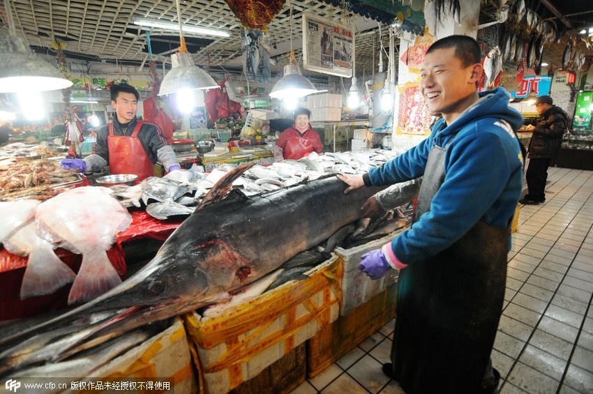 A swordfish measuring 2.77 meters long and weighing 135 kilograms is for sale at a fish stall in Qingdao, east China’s Shandong province. The fish was caught by local fishermen in the Yellow Sea near Qingdao. (CFP/Wang Haibin)