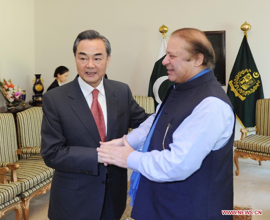 Pakistani Prime Minister Nawaz Sharif (R) shakes hands with visiting Chinese Foreign Minister Wang Yi in Islamabad, Pakistan, on Feb. 13, 2015. Pakistan and China vowed to expedite work on the China-Pakistan Economic Corridor during a meeting between Pakistani Prime Minister Nawaz Sharif and visiting Chinese Foreign Minister Wang Yi here on Friday. (Xinhua/Huang Zongzhi)