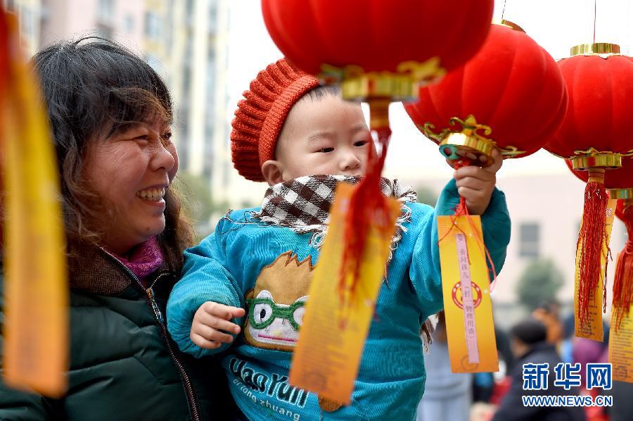 A resident guess lantern riddles with her grandson in a commnitiy temple fair in celebration of upcoming Chinese Lunar New Year in China's Anhui, Feb. 14, 2015. (Source:Xinhuanet)