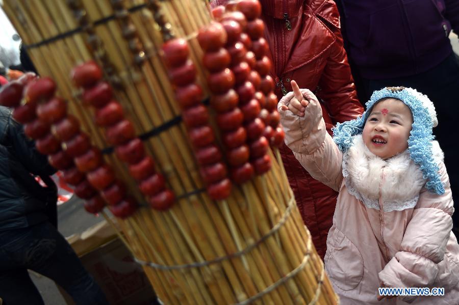 A child watches sugarcoated haws on a stick at a market in Shenyang, capital of northeast China's Liaoning Province, Feb. 15, 2015. Local residents are busy with purchasing goods for the coming Spring Festival, which falls on Feb. 19 this year. (Xinhua/Pan Yulong) |