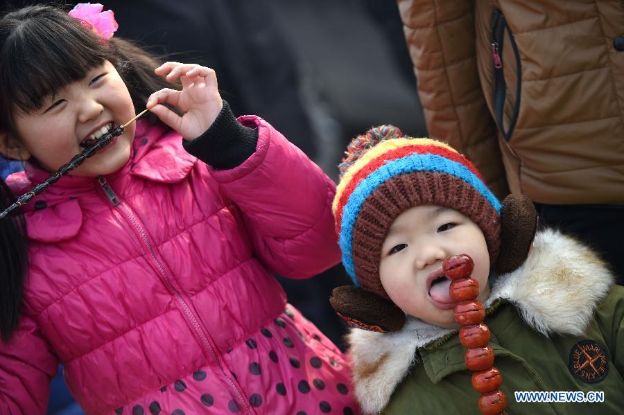 Children eat snacks at a market in Shenyang, capital of northeast China's Liaoning Province, Feb. 15, 2015. Local residents are busy with purchasing goods for the coming Spring Festival, which falls on Feb. 19 this year. (Xinhua/Pan Yulong)