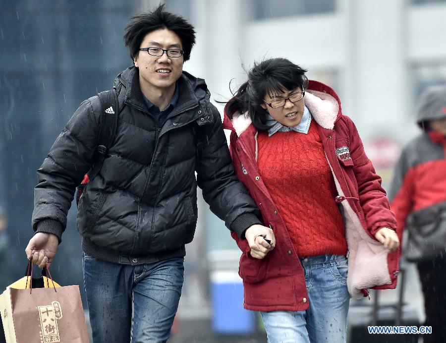Passengers run in the rain to the entrance of Tianjin railway station in Tianjin, north China, Feb. 15, 2015. A rainfall hit the city Sunday. (Xinhua/Yue Yuewei)