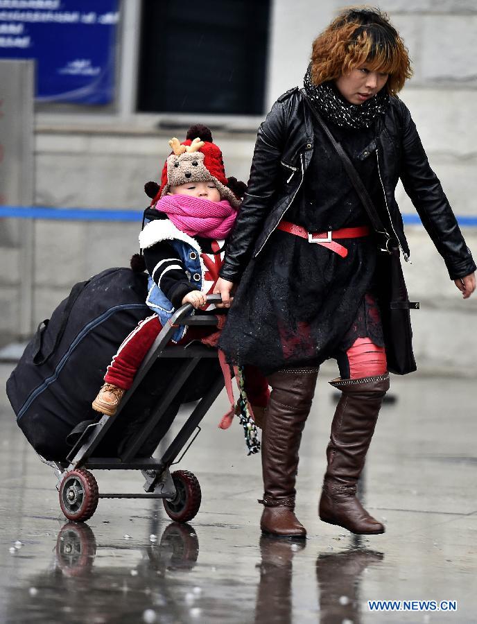 A woman pulls her luggage and her child at Tianjin railway station in Tianjin, north China, Feb. 15, 2015. A rainfall hit the city Sunday. (Xinhua/Yue Yuewei)