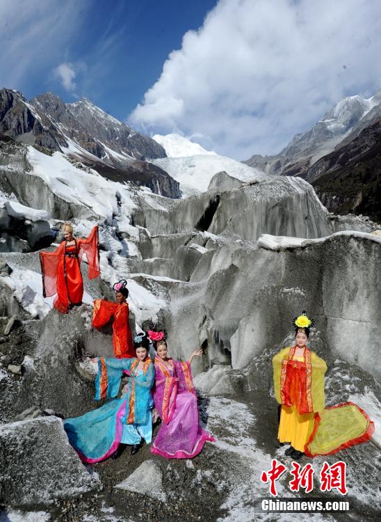 Located in southwest China’s Sichuan province, Hailuogou Valley is the lowest glacier zone in the world, and is a famous natural park in China. From Feb. 14 to Feb. 15, 2015, a group of “ancient beauties” played by models appeared at Hailuogou to attract tourists. Some models were dressed as the “God of Wealth” and handed out red envelopes to tourists. (Chinanews/Liu Zhongjun) |