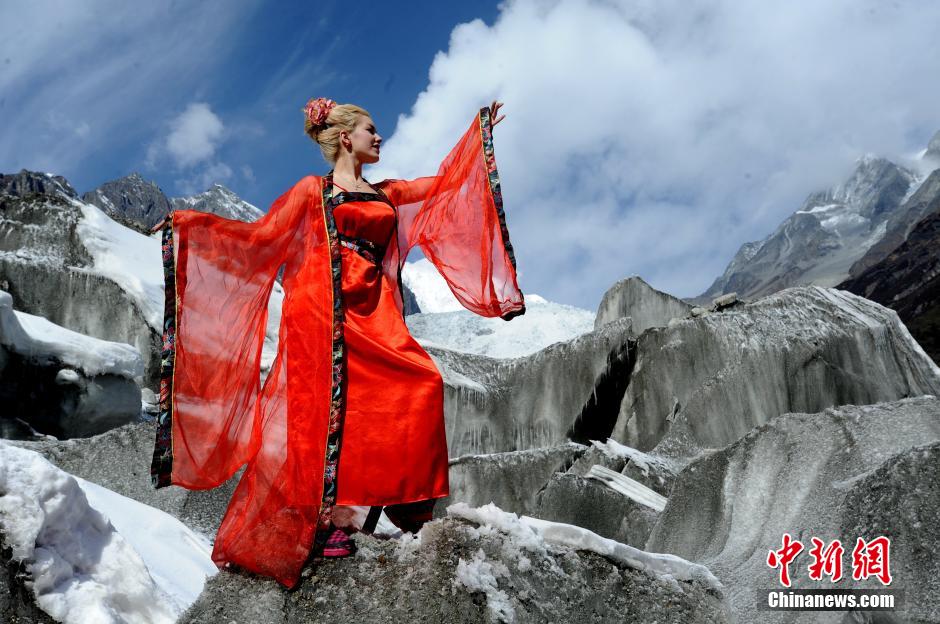 Located in southwest China’s Sichuan province, Hailuogou Valley is the lowest glacier zone in the world, and is a famous natural park in China. From Feb. 14 to Feb. 15, 2015, a group of “ancient beauties” played by models appeared at Hailuogou to attract tourists. Some models were dressed as the “God of Wealth” and handed out red envelopes to tourists. (Chinanews/Liu Zhongjun)