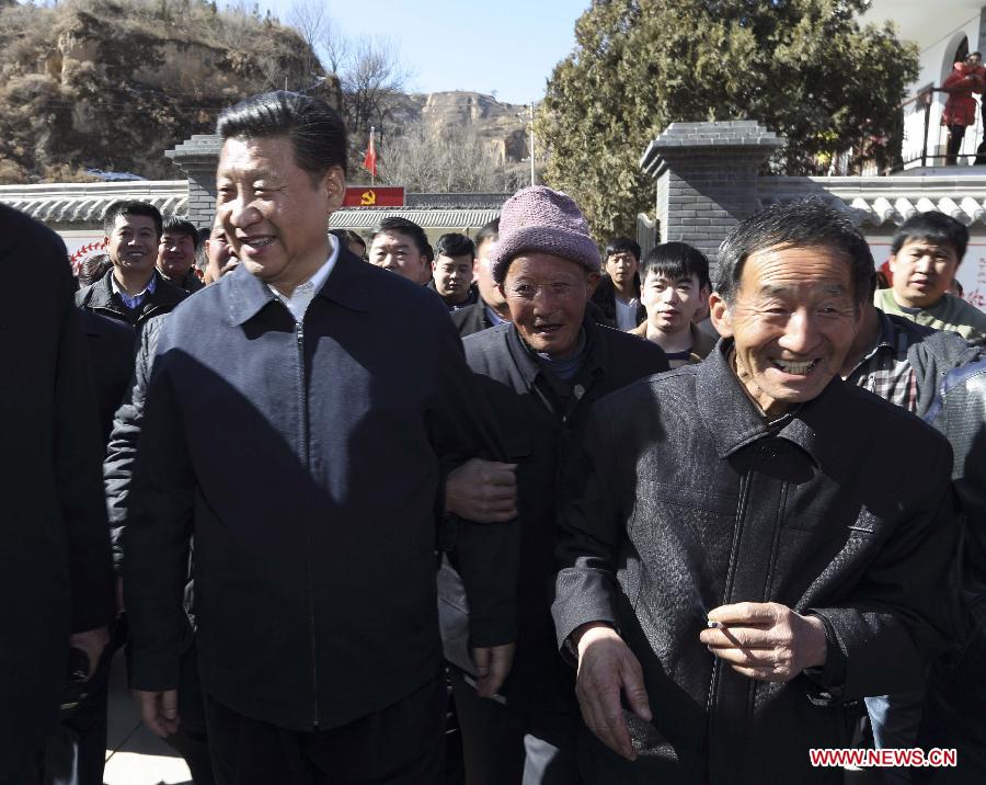Chinese President and General Secretary of the Communist Party of China Central Committee Xi Jinping (L front), also chairman of the Central Military Commission, walks with locals while visiting Liangjiahe Village, Wen'anyi Township of Yanchuan County, Yan'an, northwest China's Shaanxi Province, Feb. 13, 2015. Xi made a tour in Shaanxi on Feb. 13 - 16, and extended festival greetings to locals and people across the nation ahead of the Spring Festival, which falls on Feb. 19. (Xinhua/Lan Hongguang) |