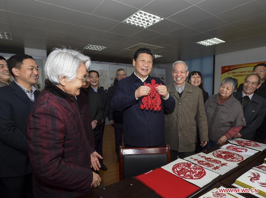 Chinese President and General Secretary of the Communist Party of China Central Committee Xi Jinping (C), also chairman of the Central Military Commission, holds a paper-cut work and offers Lunar New Year greetings to the Chinese people as he visits a community service center in Dianzicheng Subdistrict, Xi'an, capital of northwest China's Shaanxi Province, Feb. 15, 2015. Xi made a tour in Shaanxi on Feb. 13 - 16, and extended festival greetings to locals and people across the nation ahead of the Spring Festival, which falls on Feb. 19. (Xinhua/Li Xueren) |