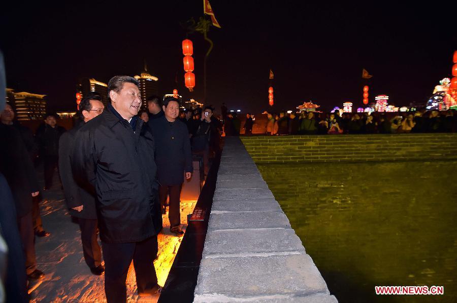 Chinese President and General Secretary of the Communist Party of China Central Committee Xi Jinping (front), also chairman of the Central Military Commission, makes an inspection on ancient wall protection in Xi'an, capital of northwest China's Shaanxi Province, Feb. 15, 2015. Xi made a tour in Shaanxi on Feb. 13 - 16, and extended festival greetings to locals and people across the nation ahead of the Spring Festival, which falls on Feb. 19. (Xinhua/Li Tao) |