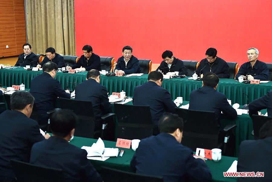 Chinese President and General Secretary of the Communist Party of China Central Committee Xi Jinping (4th L rear), also chairman of the Central Military Commission, presides over a seminar on shaking off poverty and becoming prosperous at China Executive Leadership Academy, Yan'an, northwest China's Shaanxi Province, Feb. 13, 2015. Xi made a tour in Shaanxi on Feb. 13 - 16, and extended festival greetings to locals and people across the nation ahead of the Spring Festival, which falls on Feb. 19. (Xinhua/Li Tao) |
