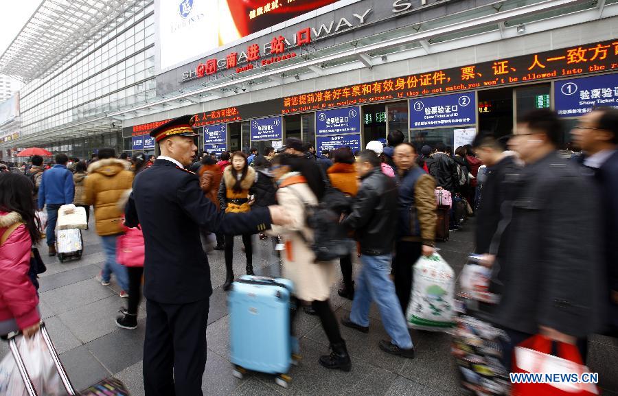 A staff member directs passengers to enter the Shanghai Railway Station in Shanghai, east China, Feb. 16, 2015. A travel rush came to its peak as passengers were hurry for home reunion during the Spring Festival or Chinese Lunar New Year, which falls on Feb. 19 this year. (Xinhua/Fang Zhe) |