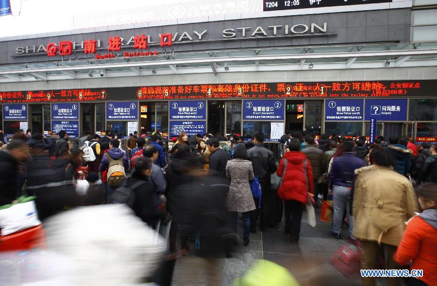 Passengers queue to enter the Shanghai Railway Station in Shanghai, east China, Feb. 16, 2015. A travel rush came to its peak as passengers were hurry for home reunion during the Spring Festival or Chinese Lunar New Year, which falls on Feb. 19 this year. (Xinhua/Fang Zhe)