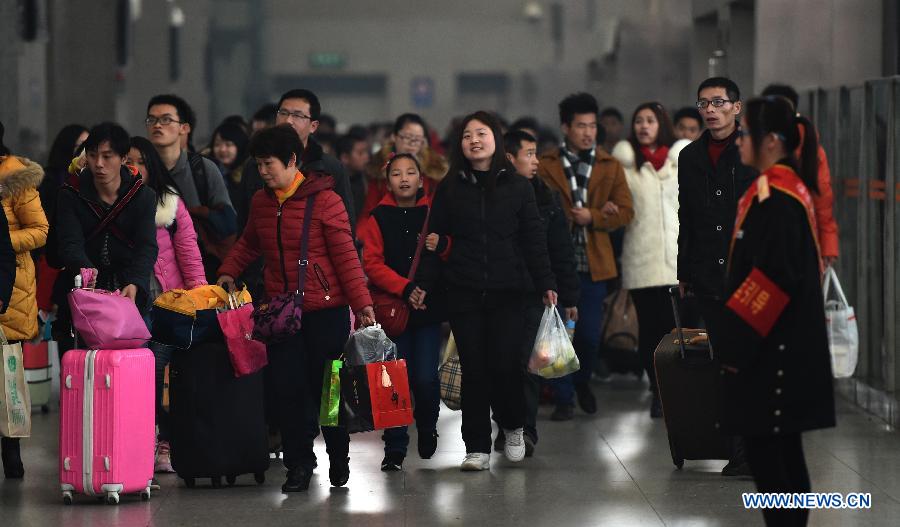 Passengers prepare to get on trains at Wuchang Railway Station in Wuhan, capital of central China's Hubei Province, Feb. 16, 2015. A travel rush came to its peak as passengers were hurry for home reunion during the Spring Festival or Chinese Lunar New Year, which falls on Feb. 19 this year. (Xinhua/Cheng Min) |