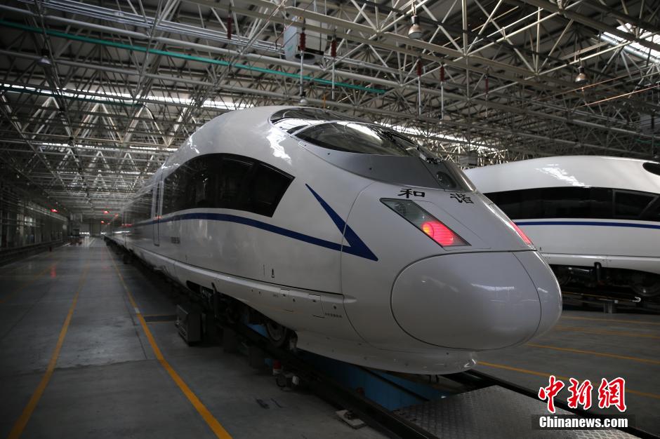 Photo shows the birth of high-speed trains at workshops in CNR Tangshan Railway Vehicle Co., Ltd. During the Spring Festival travel rush, known as "chunyun", the high-speed rail plays an irreplaceable role with its high-speed, stability and high-density. In 2014, the CNR export turnover reached 3 billion US dollars, an increase of 68.6 percent compared with the previous year. (CNS/Yang Kejia) |