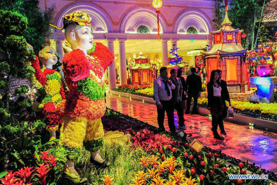 People walk past decorations celebrating Chinese Spring Festival at Bellagio Hotel in Las Vegas, the United States, Feb. 15, 2015. The Chinese Spring Festival falls on Feb. 19 this year. (Xinhua/Zhang Chaoqun)