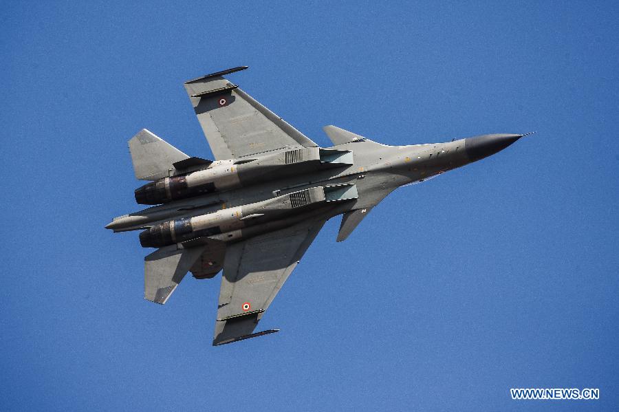 An Indian Air Force's Su-30 MKI flies during the Aero India 2015 in Air Force Station Yelahanka of Bangalore, India, Feb. 18, 2015. The biennial air show this year attracted dealers from 49 countries, showcasing their aero-related products in military and civilian fields. (Xinhua/Zheng Huansong) |