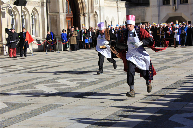 Annually Pancake Day Race held in Guildhall Yard on Tuesday. (People's Daily Online/Bai Tianxing)