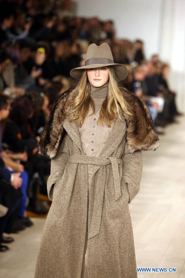 A model presents a creation of Ralph Lauren Fall/Winter 2015 collection during the New York Fashion Week in New York, the United States, Feb. 19, 2015. (Xinhua/Wu Xia)