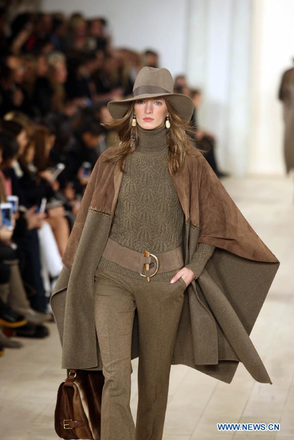 A model presents a creation of Ralph Lauren Fall/Winter 2015 collection during the New York Fashion Week in New York, the United States, Feb. 19, 2015. (Xinhua/Wu Xia)