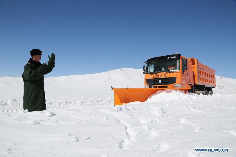 A soldier directs a plough to clear snow off snow-covered Xinjiang-Tibet Road (Mayou Mula section), Ali Prefecture, southwest China's Tibet Autonomous Region, Feb. 19, 2015. The road of the Mayou Mula section, with an altitude of 4,900 meters, was blocked by snow as a snowfall hit the region on Thursday, the first day of Chinese Lunar New Year. Rescuers from local police had to work two hours to evacuate trapped vehicles and people. (Xinhua/Tu Dunfa) |