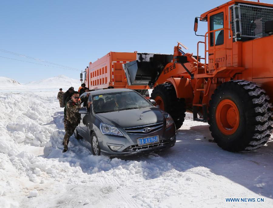 Soldiers escort a trapped car on snow-covered Xinjiang-Tibet Road (Mayou Mula section), Ali Prefecture, southwest China's Tibet Autonomous Region, Feb. 19, 2015. The road of the Mayou Mula section, with an altitude of 4,900 meters, was blocked by snow as a snowfall hit the region on Thursday, the first day of Chinese Lunar New Year. Rescuers from local police had to work two hours to evacuate trapped vehicles and people. (Xinhua/Tu Dunfa) |
