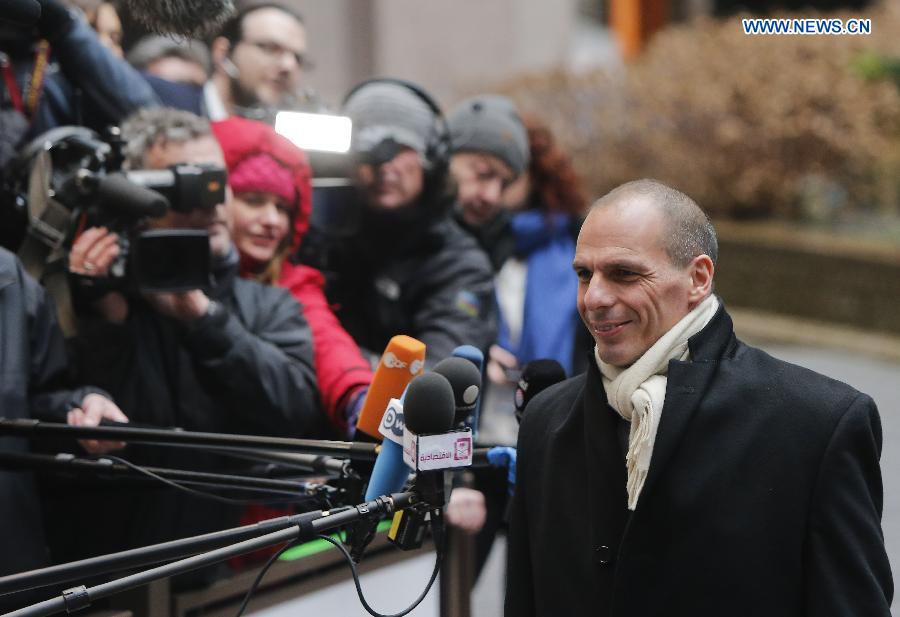 Greek Finance Minister Yanis Varoufakis arrives at an extraordinary meeting of the Eurogroup finance ministers focusing on Greece's request for a six-month extension of the four-year bailout loan agreement in Brussles, Belgium, Feb. 20, 2015. Germany rejected a request from Greece on Thursday to extend its loan agreement with eurozone creditors, saying the Greek proposal did not meet previously agreed criteria decided by the Eurogroup on Monday.(Xinhua/Zhou Lei) |