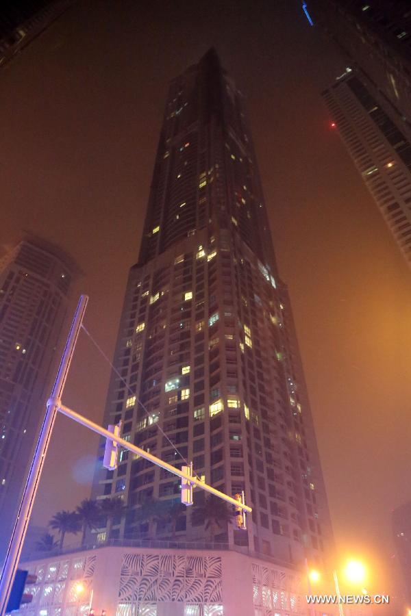 Photo taken on Feb. 21, 2015 shows the Marina Torch which caught fire on early Saturday morning in Dubai, the United Arab Emirates (UAE). The 79-story Marina Torch, one of the world's tallest building in Dubai Marina district, caught fire at 2:00 a.m. (2200 GMT Friday) Saturday and thousands of residents were evacuated from the high-rise Marina Torch and the neighboring buildings. (Xinhua/Li Zhen) |