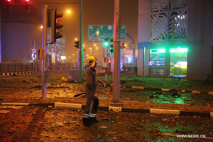 A firefighter walks by the Marina Torch which caught fire on early Saturday morning in Dubai, the United Arab Emirates (UAE), Feb. 21, 2015. The 79-story Marina Torch, one of the world's tallest building in Dubai Marina district, caught fire at 2:00 a.m. (2200 GMT Friday) Saturday and thousands of residents were evacuated from the high-rise Marina Torch and the neighboring buildings. (Xinhua/Li Zhen) |
