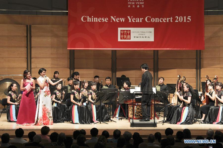 Chinese musicians perform during a traditional Chinese music concert to celebrate Chinese New Year in a Chinese cultural center in Sydney, Australia, Feb. 20, 2015. (Xinhua/Jin Linpeng)