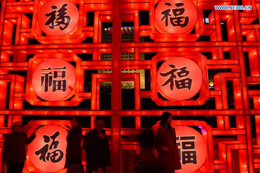 People pose for photos near a giant lantern at a lantern show which is to celebrate the Spring Festival in Xining City, capital of northwest China's Qinghai Province, Feb. 22, 2015. (Xinhua/Zhang Hongxiang)