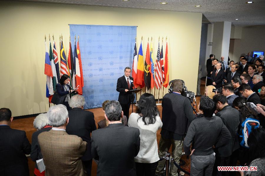 Chinese Foreign Minister Wang Yi holds a press conference after presiding over a United Nations Security Council open debate on international peace and security at the UN headquarters in New York, the United States, on Feb. 23, 2015. (Xinhua/Niu Xiaolei) |