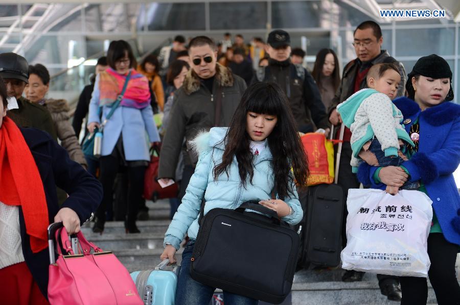 Passengers prepare to get on trains at the Railway Station in Xining City, capital of northwest China's Qinghai Province, Feb. 23, 2015. China saw a passenger flow return peak on Monday as the week-long Lunar New Year holiday drew to an end. (Xinhua/Zhang Hongxiang) |