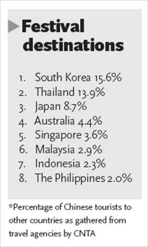 The China National Tourism Administration (CNTA) rated South Korea, Thailand and Japan as the top three destinations for Chinese tourists for the 2015 Lunar New Year holidays.