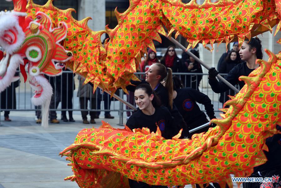 Members of the NDI (National Dance Institute) Celebration Team give a free outdoor performance as a part of the New York Philharmonic's celebration of Chinese New Year, at the Lincoln Center Plaza, New York, the United States, on Feb. 24, 2015. (Xinhua/Wang Lei)