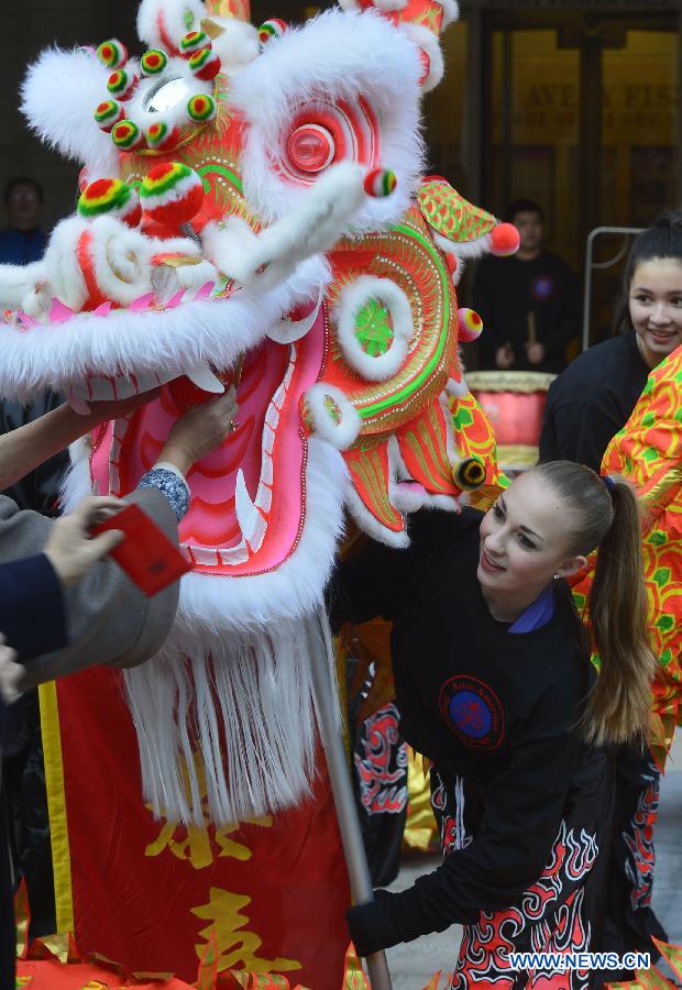 Members of the NDI (National Dance Institute) Celebration Team give a free outdoor performance as a part of the New York Philharmonic's celebration of Chinese New Year, at the Lincoln Center Plaza, New York, the United States, on Feb. 24, 2015. (Xinhua/Wang Lei)