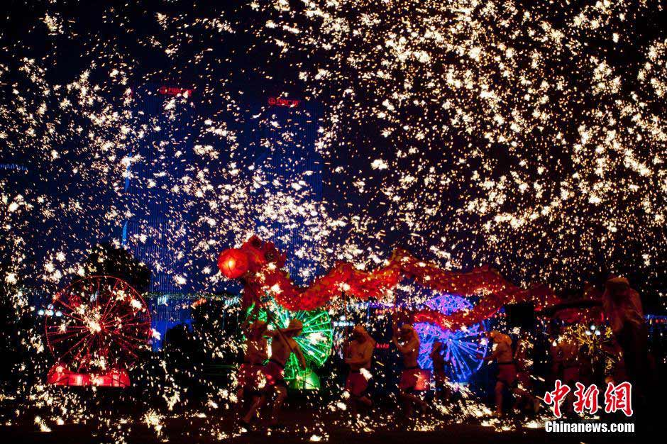 A fire dragon show from Chongqing is held in Changsha, east China's Hunan province on Feb. 18, 2015. The fire dragon show has a history of more than 600 years. (CNS/Zhou Jinjun)