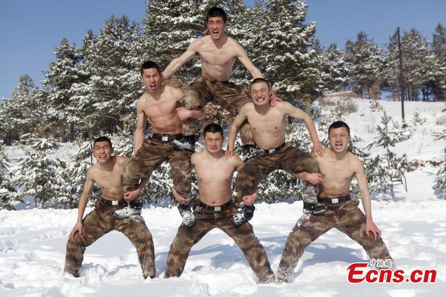 China’s frontier soldiers form a human pyramid during training in Heihe, Northeast China’s Heilongjiang province, Feb. 26, 2015. The temperature dropped to minus 10 degrees Centigrade on Thursday. (Photo: China News Service/Wei Jianshun)
