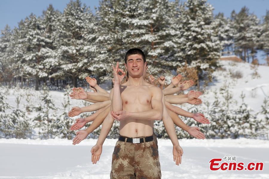 China’s frontier soldiers perform the dance of "Thousand-hand Avalokitesvara Bodhisattva", or "Guan Yin", a Chinese goddess, during training in Heihe, Northeast China’s Heilongjiang province, Feb. 26, 2015. The temperature dropped to minus 10 degrees Centigrade on Thursday. (Photo: China News Service/Wei Jianshun) |