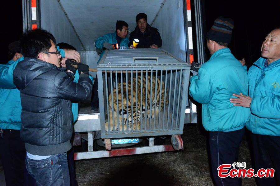Two illegally-kept tigers are seen being transferred by workers to a wildlife conservation center in Qingdao, East China’s Shandong province on February 26, 2015. The two tigers were found being kept in a high-rise building in Pingdu city with another young tiger which jumped to its death on February 18, Lunar New Year’s Eve. The tiger was frightened by Spring Festival firecrackers and escaped from the cage. (Photo: China News Service/ Yu Fangping)