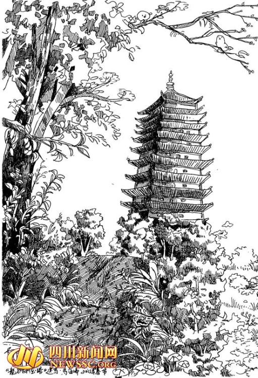 Ma Hairui’s pen sketch of a historical site in Deyang, Southwest China’s Sichuan province during the Spring Festival holiday. (Photo/newssc.org)