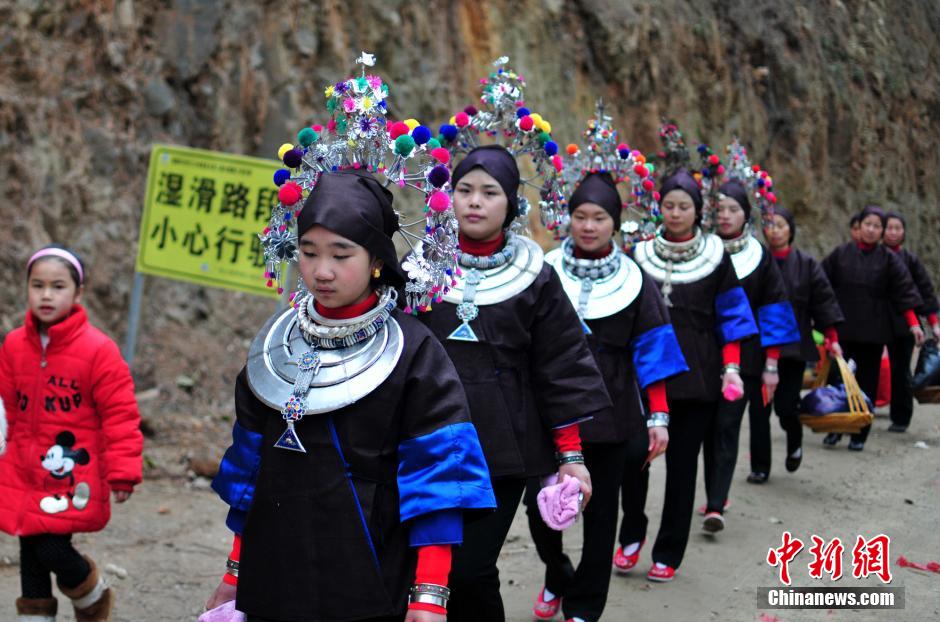 The bridal procession walks on the road. (Chinanews/Gong Pukang)