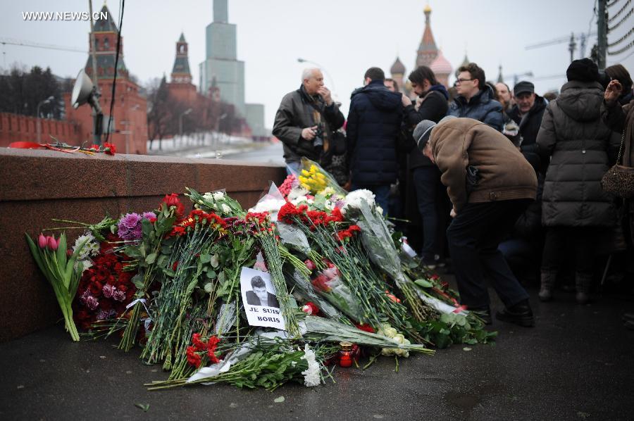 A man lays flowers on the murder site of Russian opposition leader Boris Nemtsov in Moscow, Russia, on Feb. 28, 2015. People came to the murder site of Boris Nemtsov for mourning on Saturday. Boris Nemtsov was shot and killed near the city center on Feb. 27, 2015. (Xinhua/Dai Tianfang) |