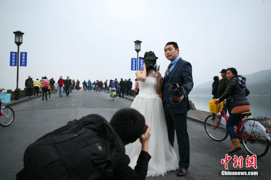 A newly-married couple take wedding photos with gas mask on Feb. 26, 2015, in Hangzhou, east China's Zhejiang province. The bridegroom is a DJ in the city, who advocates environmental protection in daily life. (CNS/Li Chenyun)