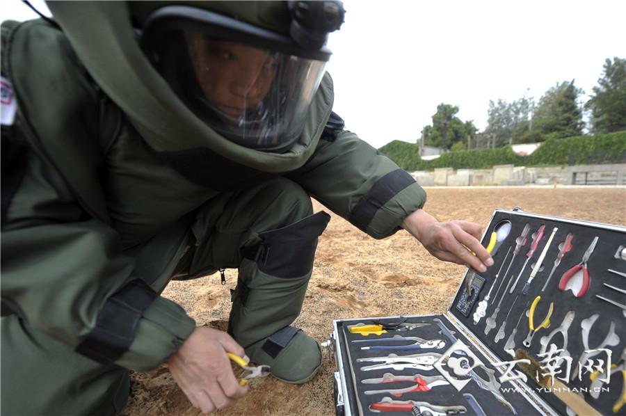 Several soldiers in the People's Armed Police Yunnan General Corps receive rigorous psychological trainings and trainings on how to use the professional equipment before they are capable of safely disposing of explosives. (Photo/Yunnan.cn)